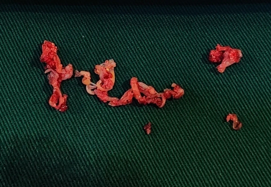 將這些動脈斑塊清除之后,又利用球囊為患者進行血管擴張,病變血管形態(tài)改善良好,可以清楚看到血管內(nèi)大量增生內(nèi)膜被旋切出來,取出遠端保護傘可以看見大量過濾的內(nèi)膜組織。