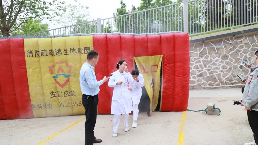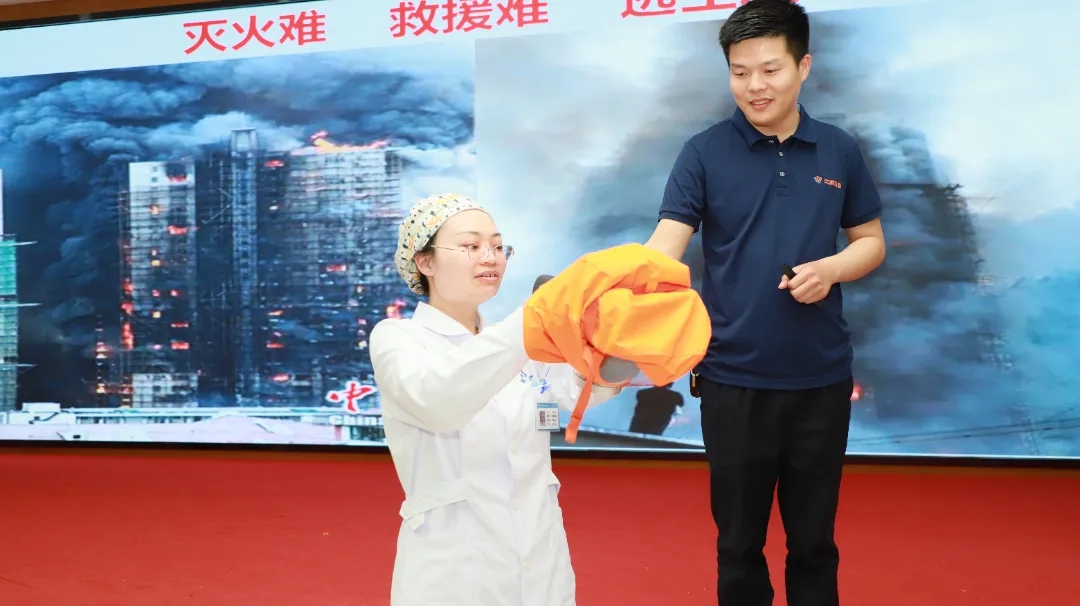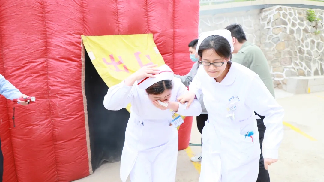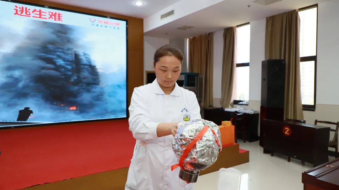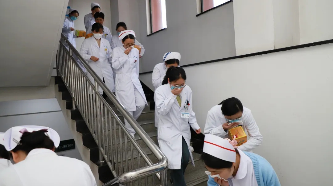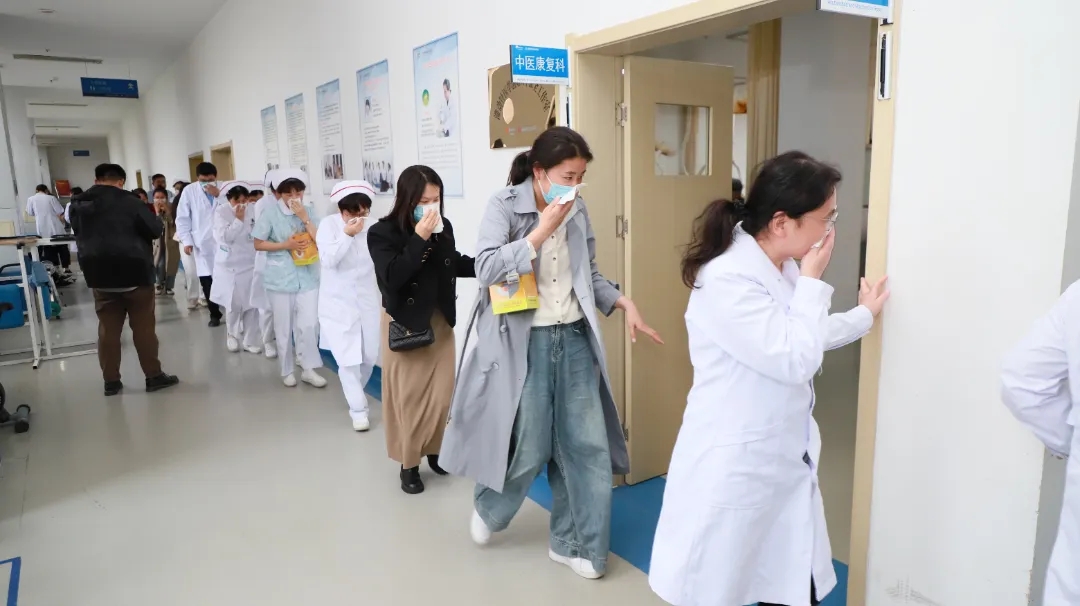 培訓(xùn)結(jié)束后,教員組織所有參會人員在門診5樓開展了火災(zāi)疏散、逃生應(yīng)急演練。伴隨著指揮員發(fā)布火災(zāi)訊號,參加演練人員拿起毛巾捂住口鼻、躬身前行,有序地向安全出口“逃離”至安全地帶。