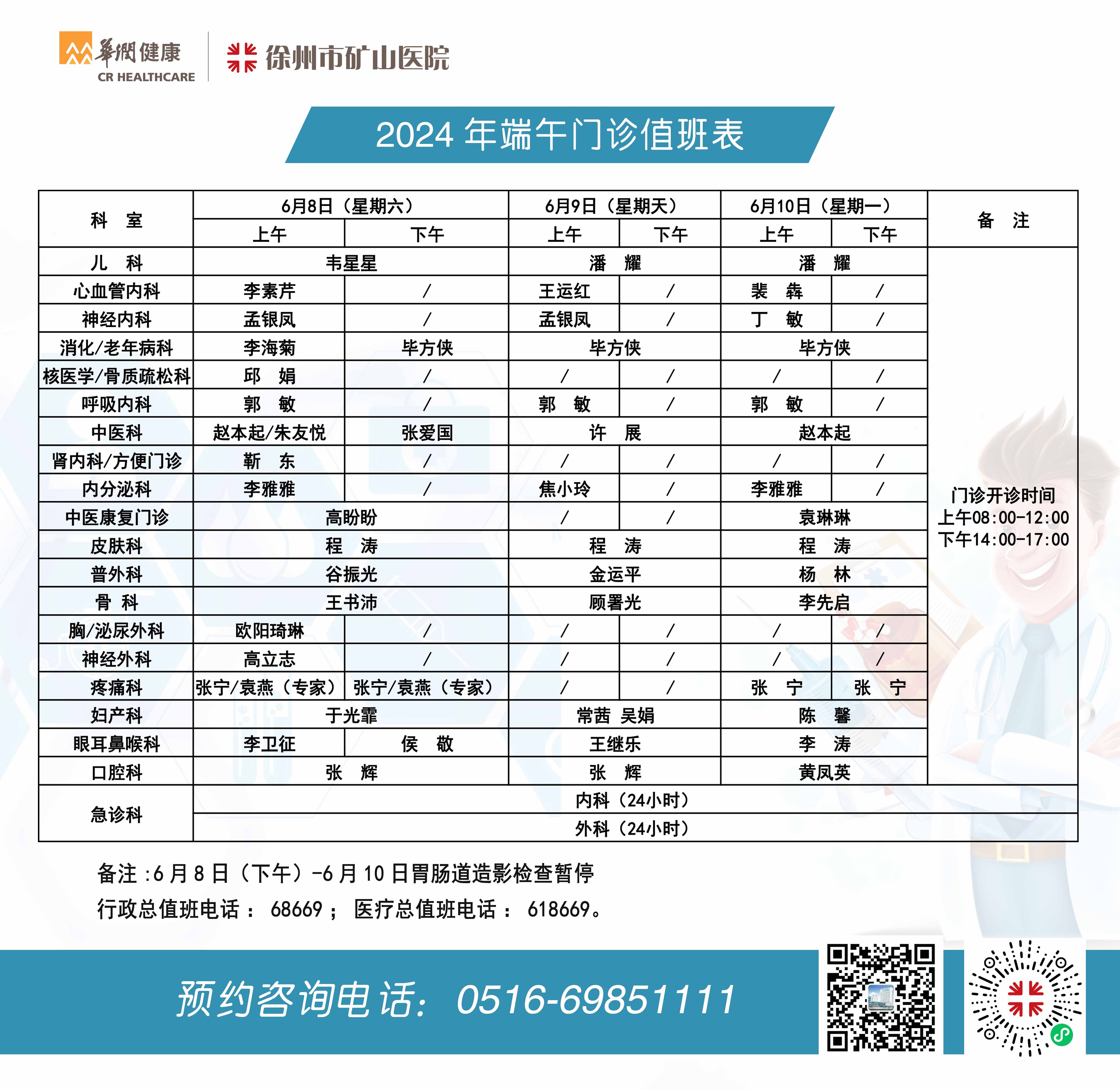 放假期間,徐州市礦山醫(yī)院門診正常接診,急診24小時接診。6月8日(下午)-6月10日胃腸道造影檢查暫停,檢驗(yàn)、彩超、心電圖、X光、CT、磁共振、胃鏡、腸鏡、喉鏡等輔助檢查可正常進(jìn)行,保證就診患者完成各項(xiàng)常規(guī)的化驗(yàn)和檢查。
