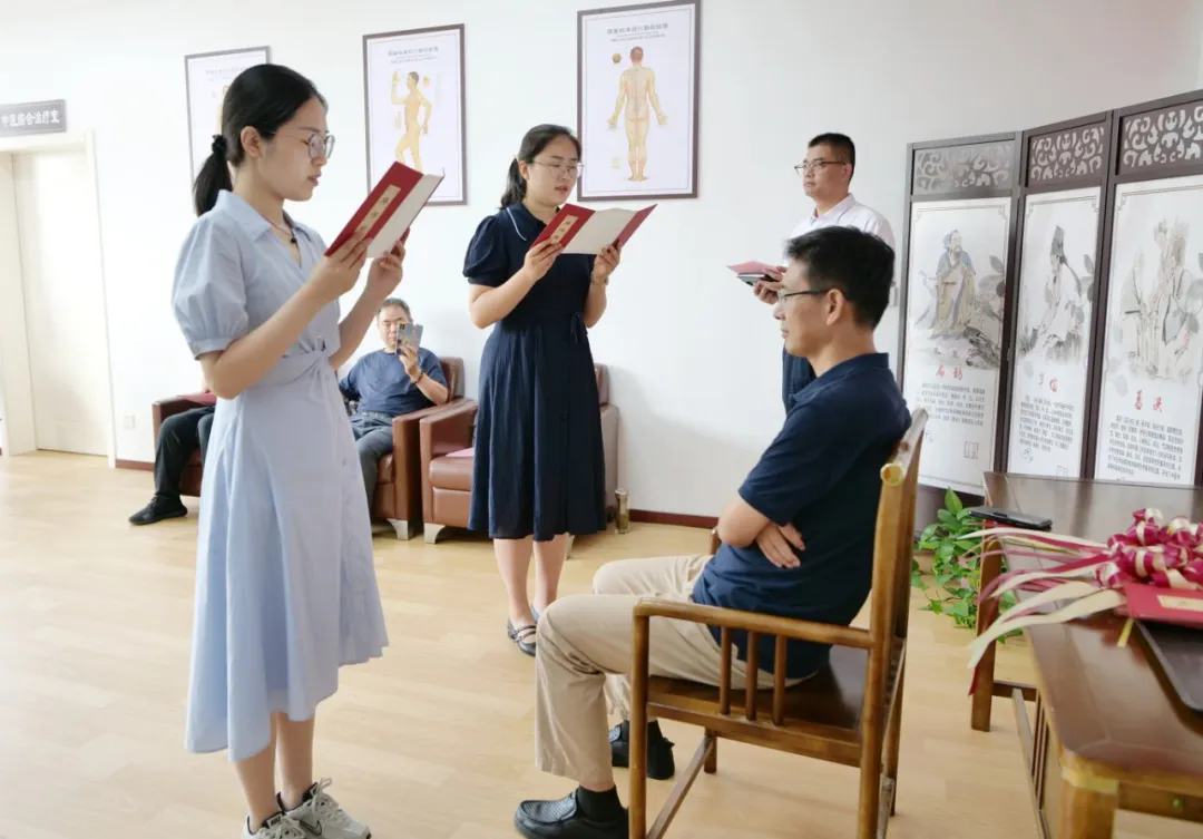 南京鼓樓醫(yī)院仙林院區(qū)住院中醫(yī)師、碩士研究生金文和南京中醫(yī)藥大學博士研究生李煜經(jīng)過嚴格遴選且有一定醫(yī)藥行業(yè)基礎的中醫(yī)學術繼承人共行拜師大禮,與賈先紅教授結下一生的師徒情誼。