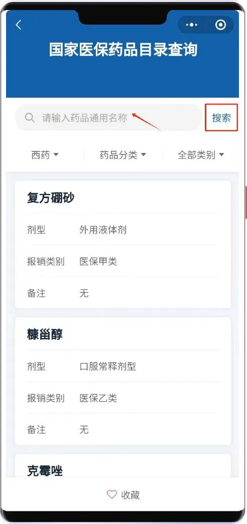 1、你可以輸入藥品通用名稱,點擊搜索,即可了解該藥品報銷類別等詳細信息!