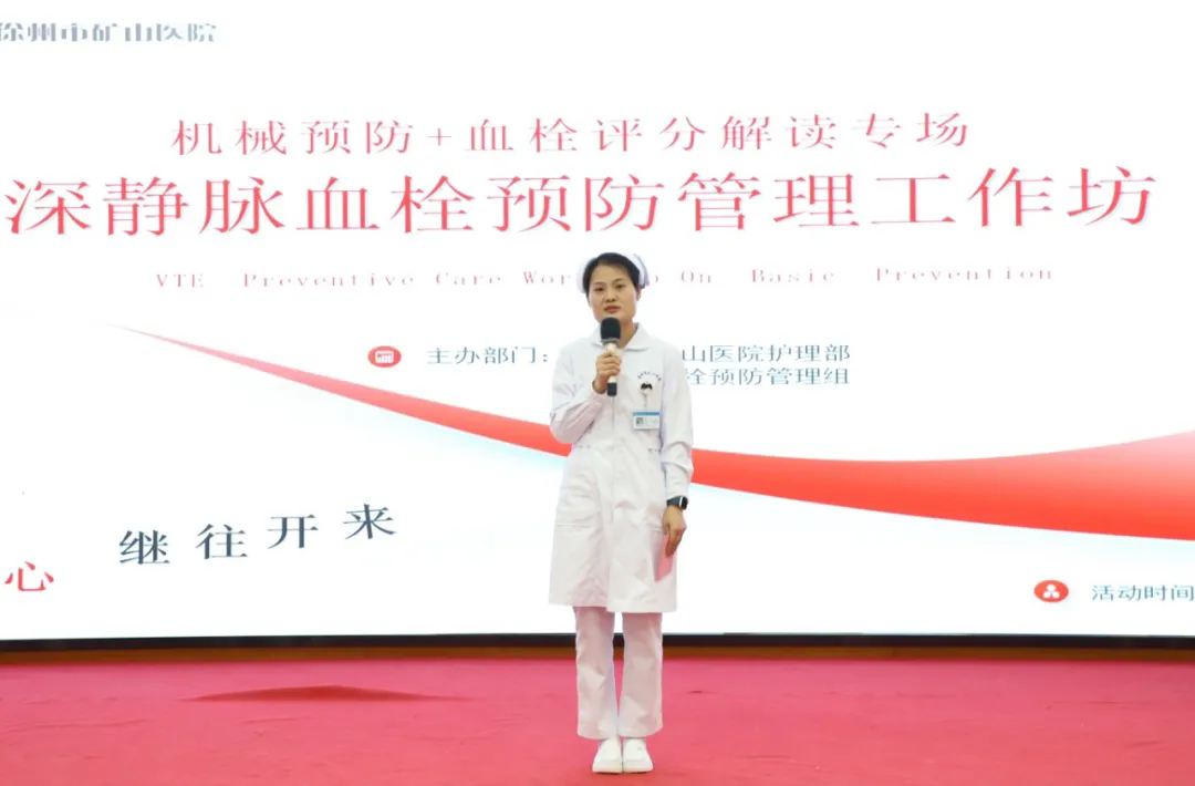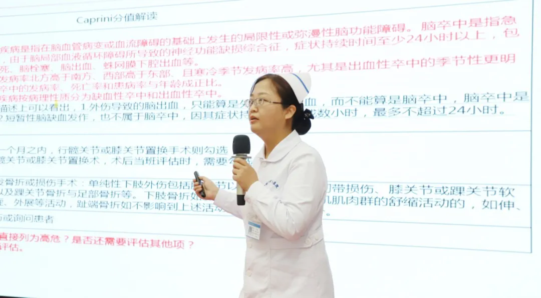 深靜脈血栓預防管理組組長劉蕊講授《血栓評分解讀》,她表示,正確的風險評估,規(guī)范措施的落實,能有效減少護理并發(fā)癥,為我們的護理質量安全保駕護航。