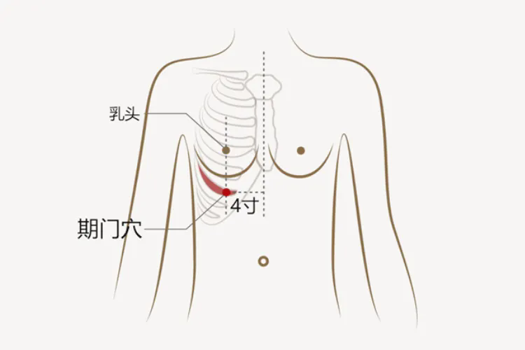 期門穴在身體的乳頭直下,第6肋間隙中。