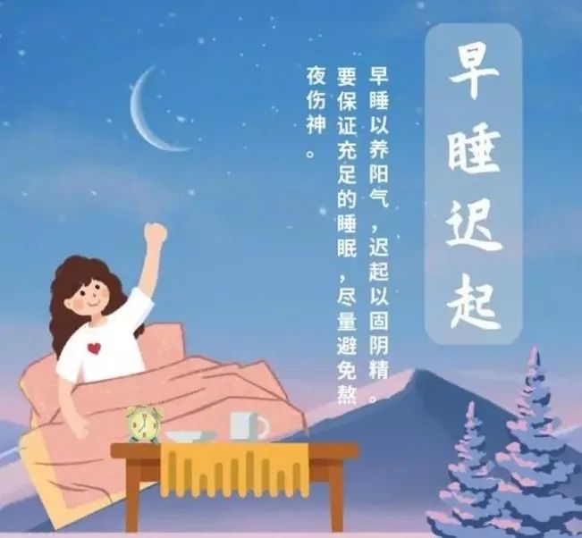 大寒正值生機潛伏、萬物蟄藏的冬季,人體的陰陽消長代謝也處于相當緩慢的時候。大寒養(yǎng)生要順應冬季"藏"的原則,最簡單的方法是早睡晚起,每天多睡1小時。早睡可以養(yǎng)人體的陽氣,晚起可以養(yǎng)陰氣,使精氣內聚以潤五臟,從而增強身體的免疫力。