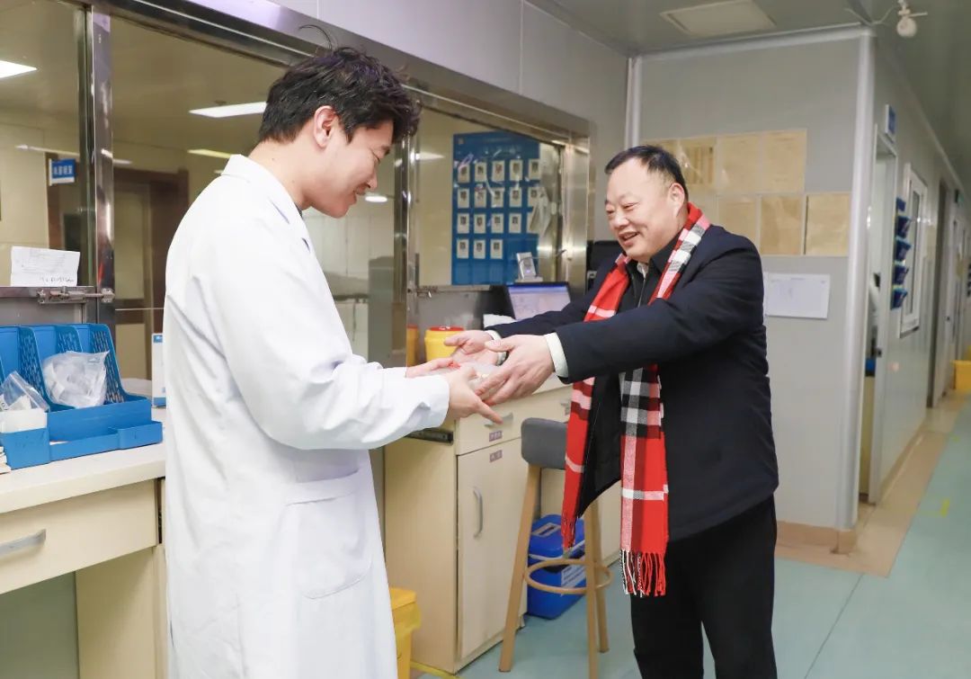 醫(yī)院里充滿了年的味道、家的感覺。他們分別深入到各個病區(qū)病房,慰問不能回家過節(jié)的住院患者和在院值班的醫(yī)護人員,將一份份熱氣騰騰的餃子送到患者和醫(yī)護人員的手中。向患者及家屬致以新春的問候和美好的祝福,對假日期間堅守在工作崗位的員工們表示慰問和感謝。